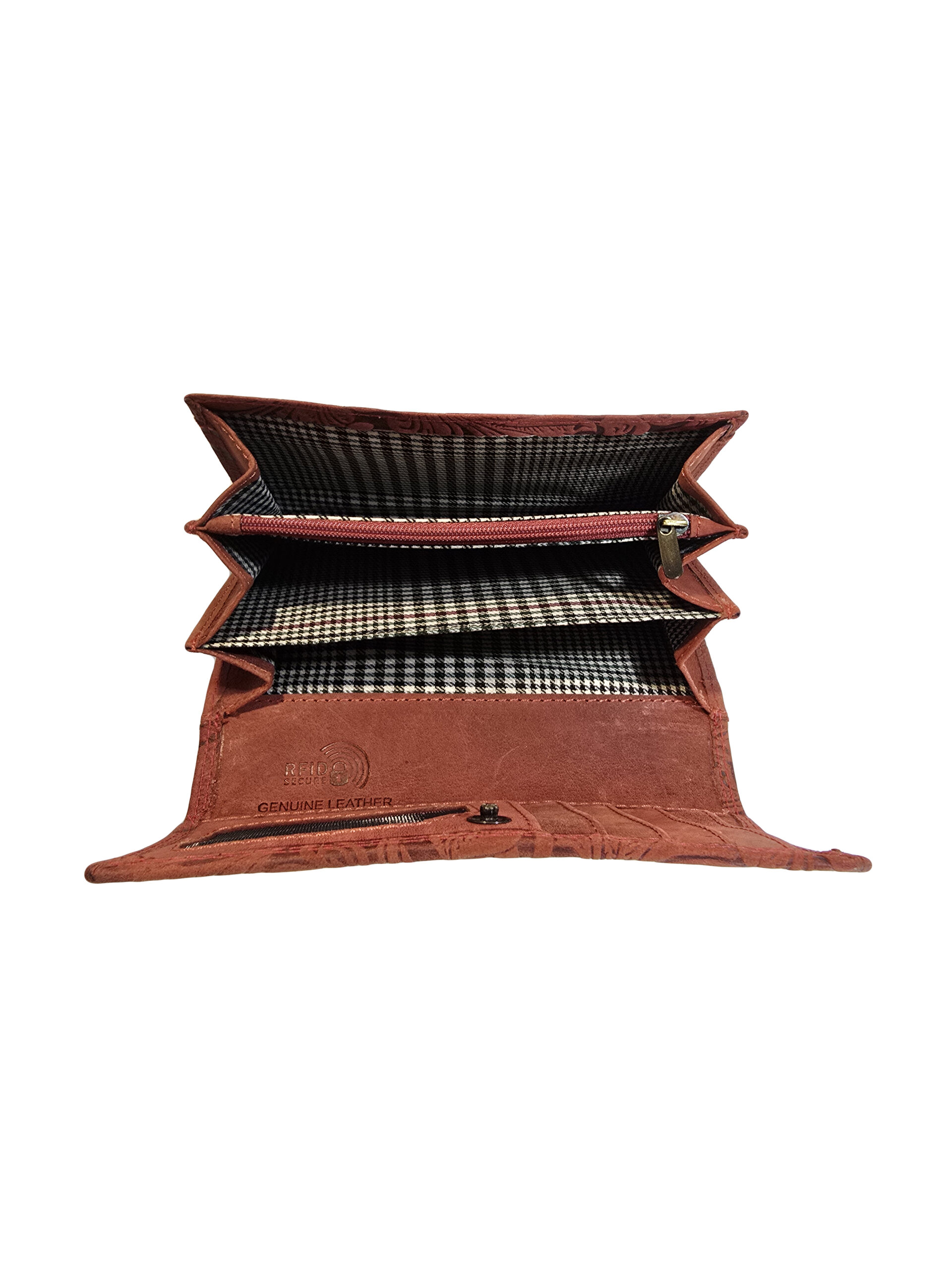 Дамско портмоне „Кристин“ комбинира артистичен релеф и практична организация. Изработено от плътна биволска кожа в топъл оранжев нюанс, портмонето е украсено с изящен флорален орнамент, който играе със светлината и придава характер. Капакът с тик-так пази съдържанието компактно, а интериорът е замислен като мини-органайзер: два дълги гофрирани отдела за банкноти и бележки, централен ципов джоб за монети, допълнителен вътрешен цип (на самия капак) и заден външен цип за дребни, до които искаш бърз достъп. Отляво има слотове за карти и прозорец за документ, подплатени с текстил на каре. Вградената RFID защита блокира нежелано сканиране на безконтактни карти.