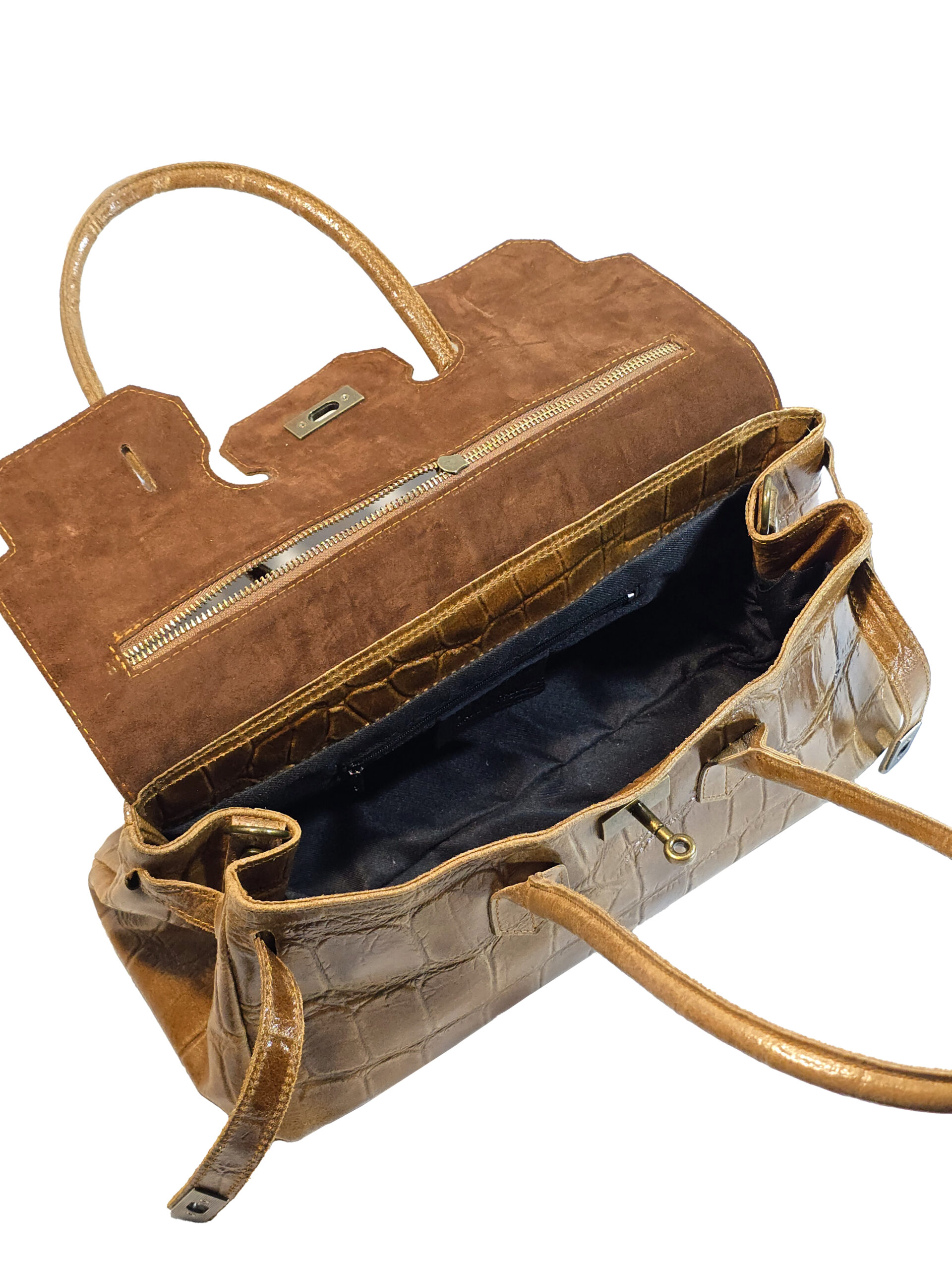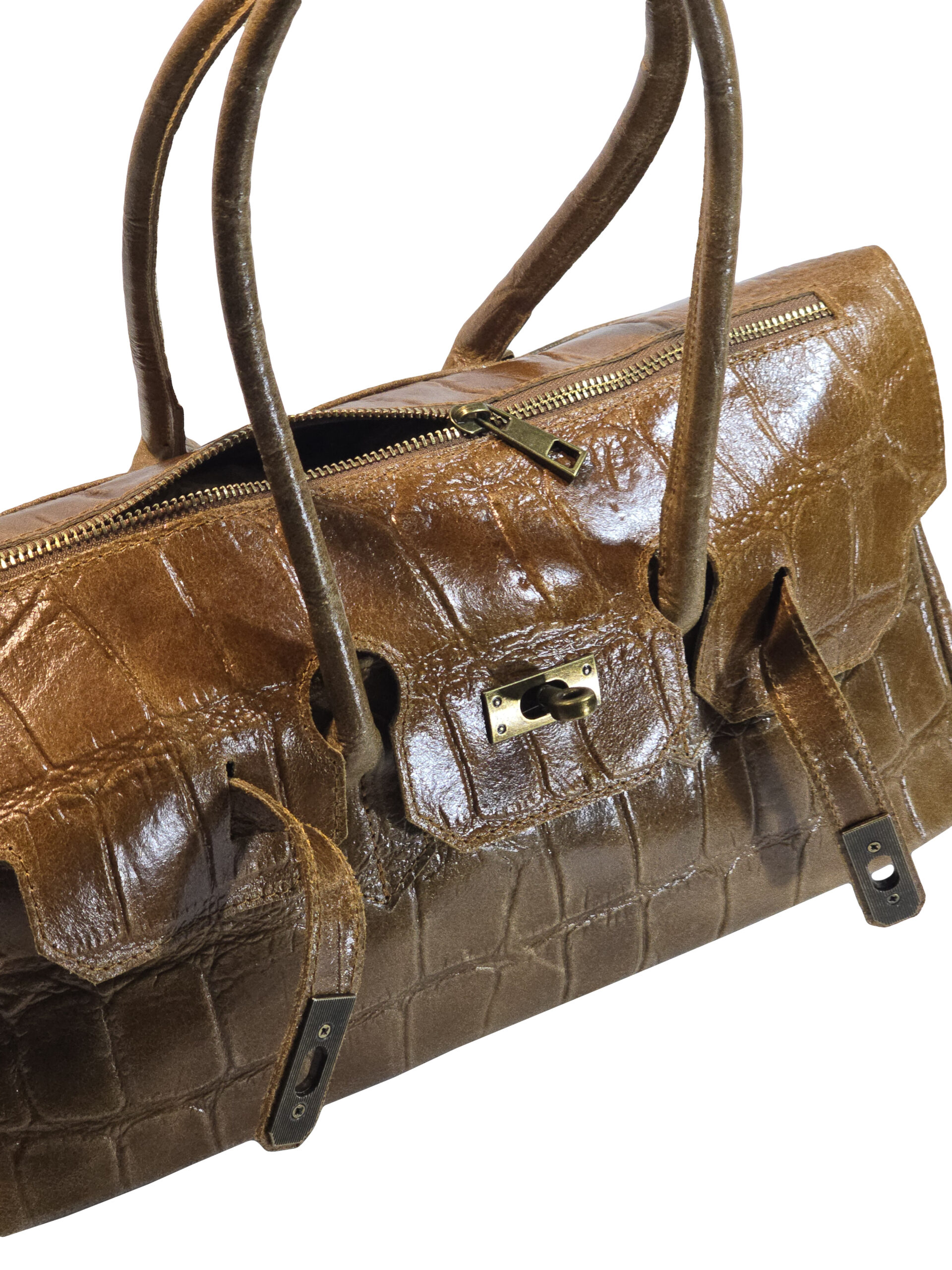 Чанта „Аурелия“ е италианска дамска чанта от естествена кожа с изразен релеф и луксозно излъчване. Моделът е със структурирана линия и комфортни дръжки за носене в ръка, а горният отвор се затваря сигурно с цип. Отгоре чантата се допълва от капак с декоративни каишки и метална закопчалка, които придават характер и завършен стил.