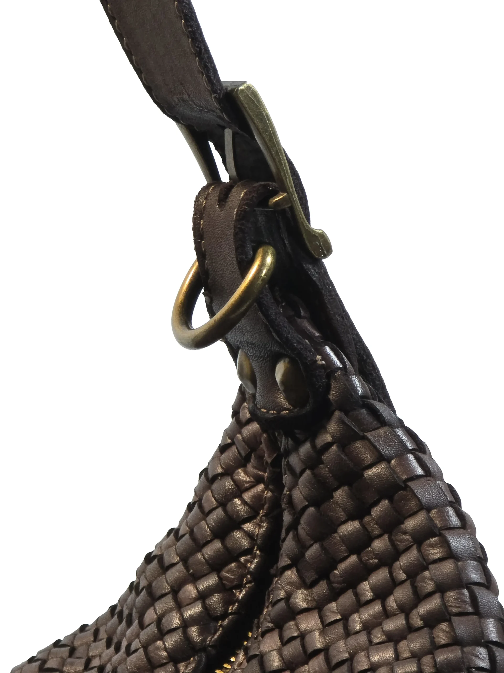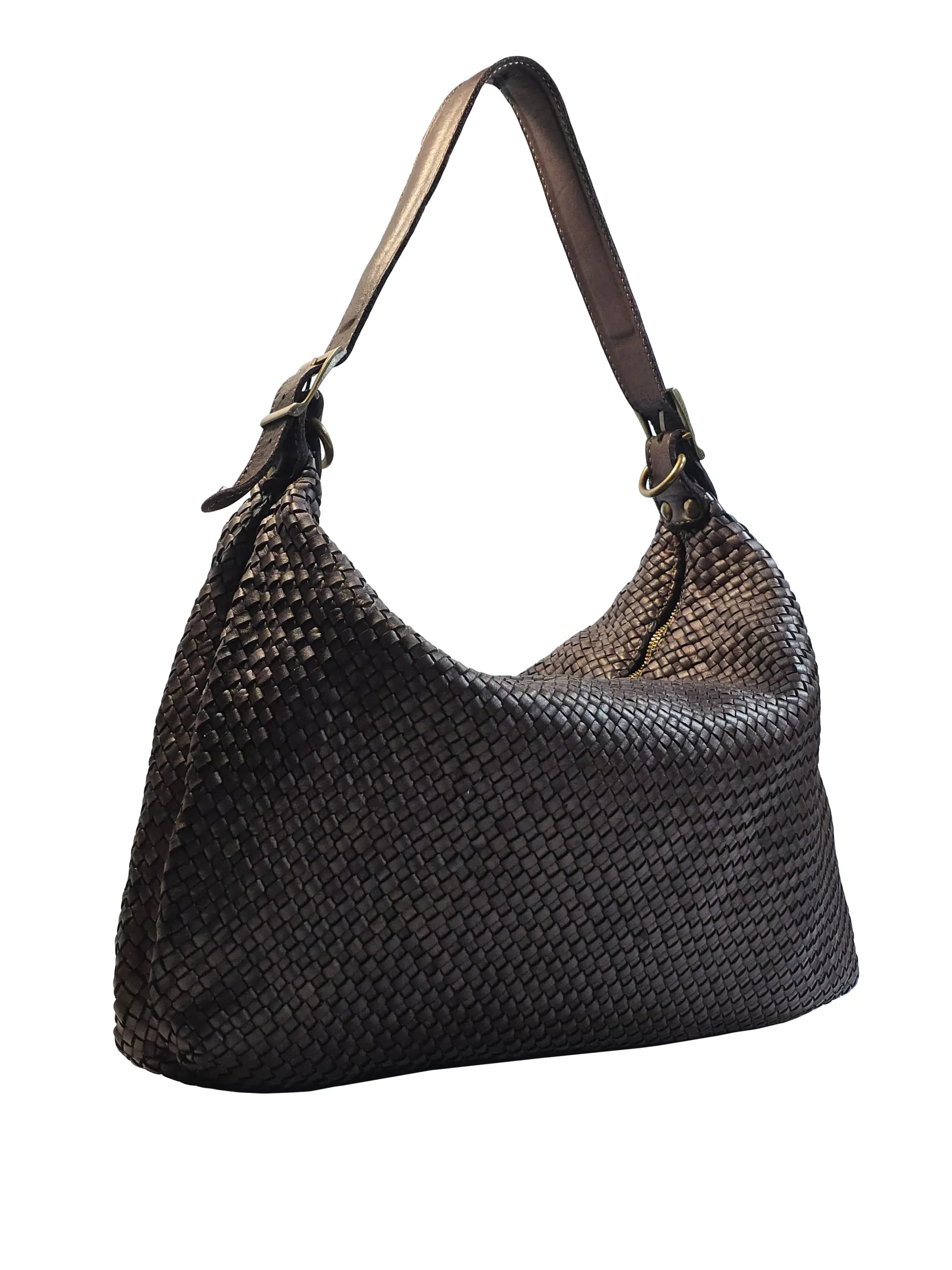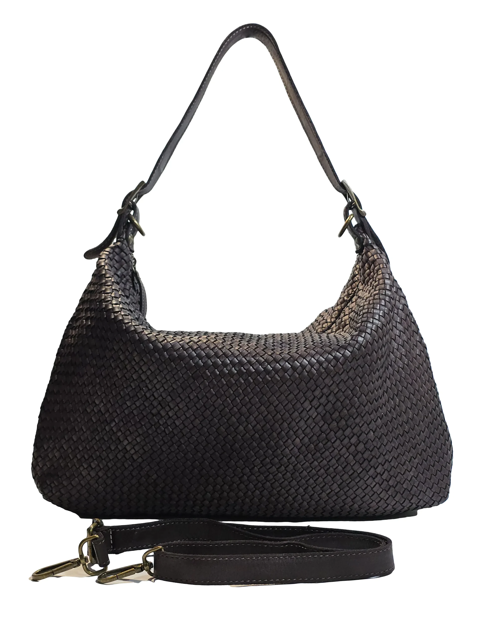 Чанта „Бела“ е италианска дамска чанта от естествена варена кожа, изпъкваща с плетена структура и елегантен, леко заоблен силует. Основното отделение се затваря с цип, който държи вещите сигурно, без да отнема от удобството при ежедневна употреба. Късите презрамки са регулируеми с катарама за по-точно прилягане на рамо, а включената сваляема дълга презрамка позволява носене и през тяло. Металният обков и карабинерите добавят характер и устойчивост, а мекото тяло се оформя естествено според съдържанието, без да губи стилната си линия.