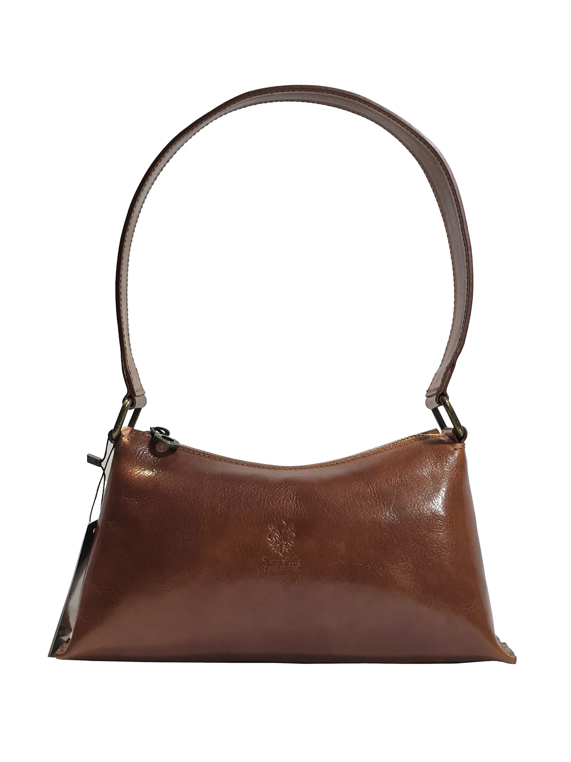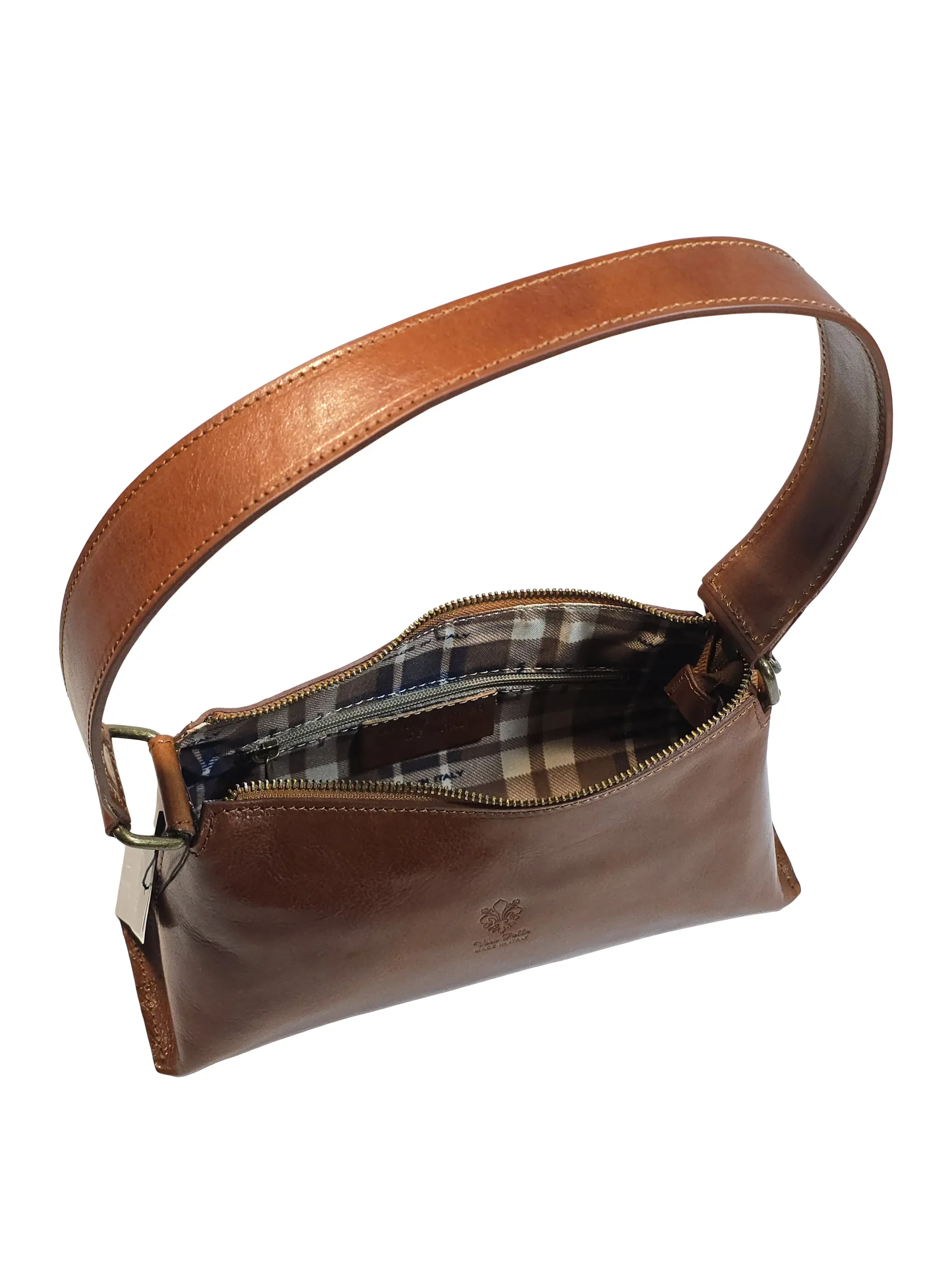 Чанта „Дея“ е изработена от естествена кожа и впечатлява с изчистен силует тип baguette/shoulder bag, който приляга близо до тялото. Моделът има удобна къса презрамка за носене на рамо, а основното отделение се затваря с цип за сигурност през целия ден. Интериорът е подплатен и включва практичен вътрешен джоб с цип за ценности и дребни аксесоари. Дискретният месингов обков по халките и ципа добавя характер и гарантира надеждност при ежедневна употреба.