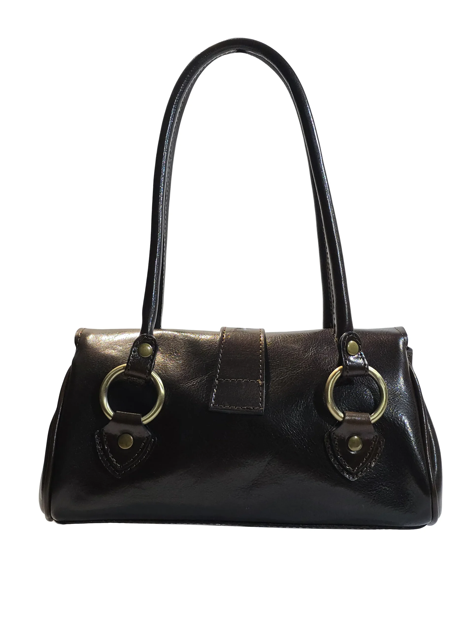 Чанта „Мелора“ е изработена от естествена кожа и впечатлява с класически дизайн тип baguette, завършен с капак и акцентен месингов обков. Моделът има дълги презрамки за удобно носене на рамо, а предното закопчаване с метална катарама придава характер и стабилност. Под капака се разкрива добре организиран интериор с вътрешно отделение с цип за ценности и допълнителни пространства за по-дребни вещи. Компактната форма стои прибрано до тялото и е отличен избор за градски ритъм, срещи и вечерни излизания.