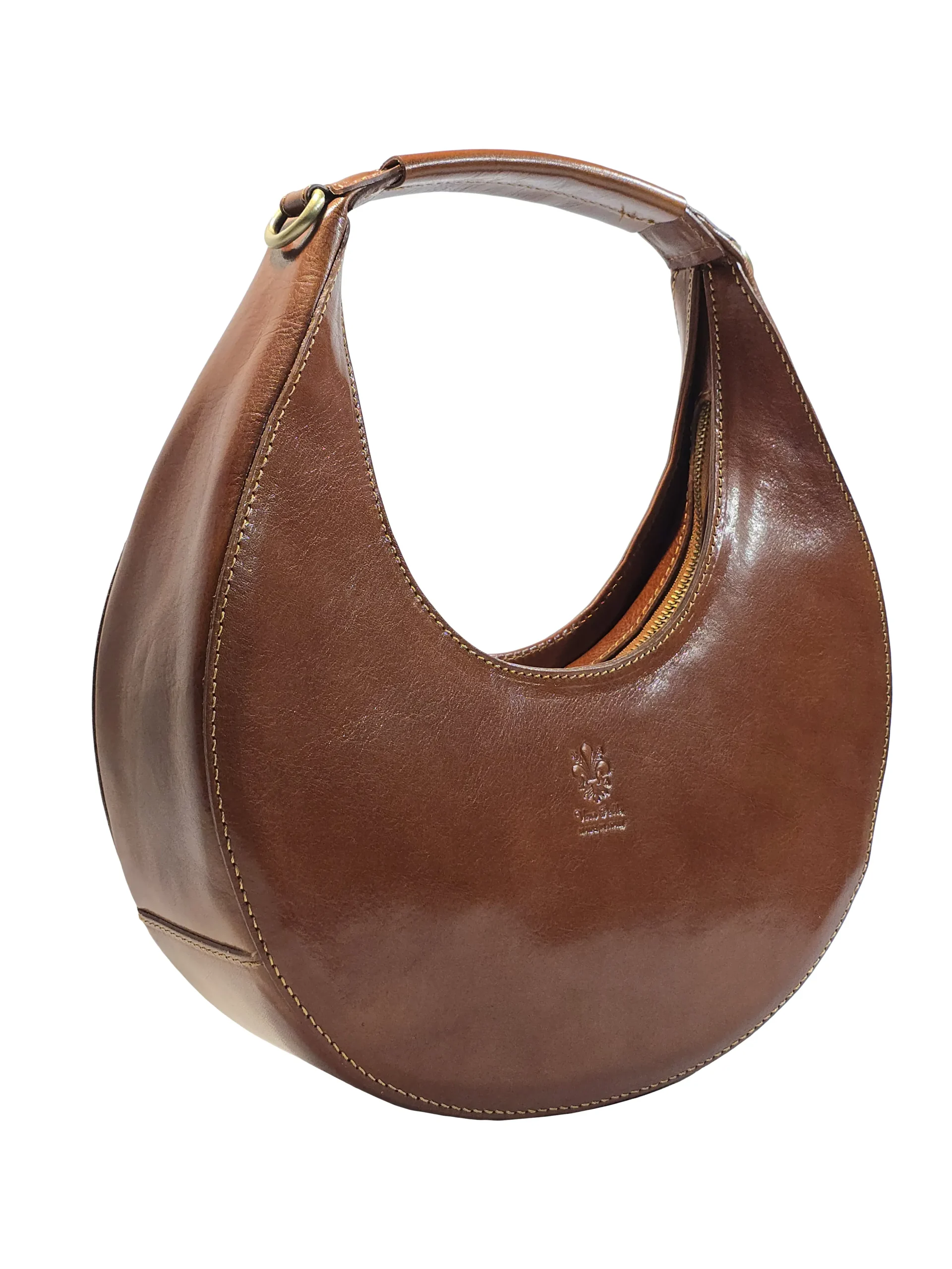 Чанта „Славея“ е изработена от естествена кожа и впечатлява с меко закръглен силует тип hobo/полумесец, който стои стилно както в ръка, така и на рамо. Горната къса дръжка е комфортна за носене, а свалящата се регулируема презрамка позволява бързо да преминете към crossbody. Основното отделение се затваря с цип, за да държи вещите сигурни, а вътре има практично разпределение за по-добра организация. Дискретният метален обков (D-халки, карабинери и цип) допълва модела и гарантира надеждност при ежедневна употреба.
