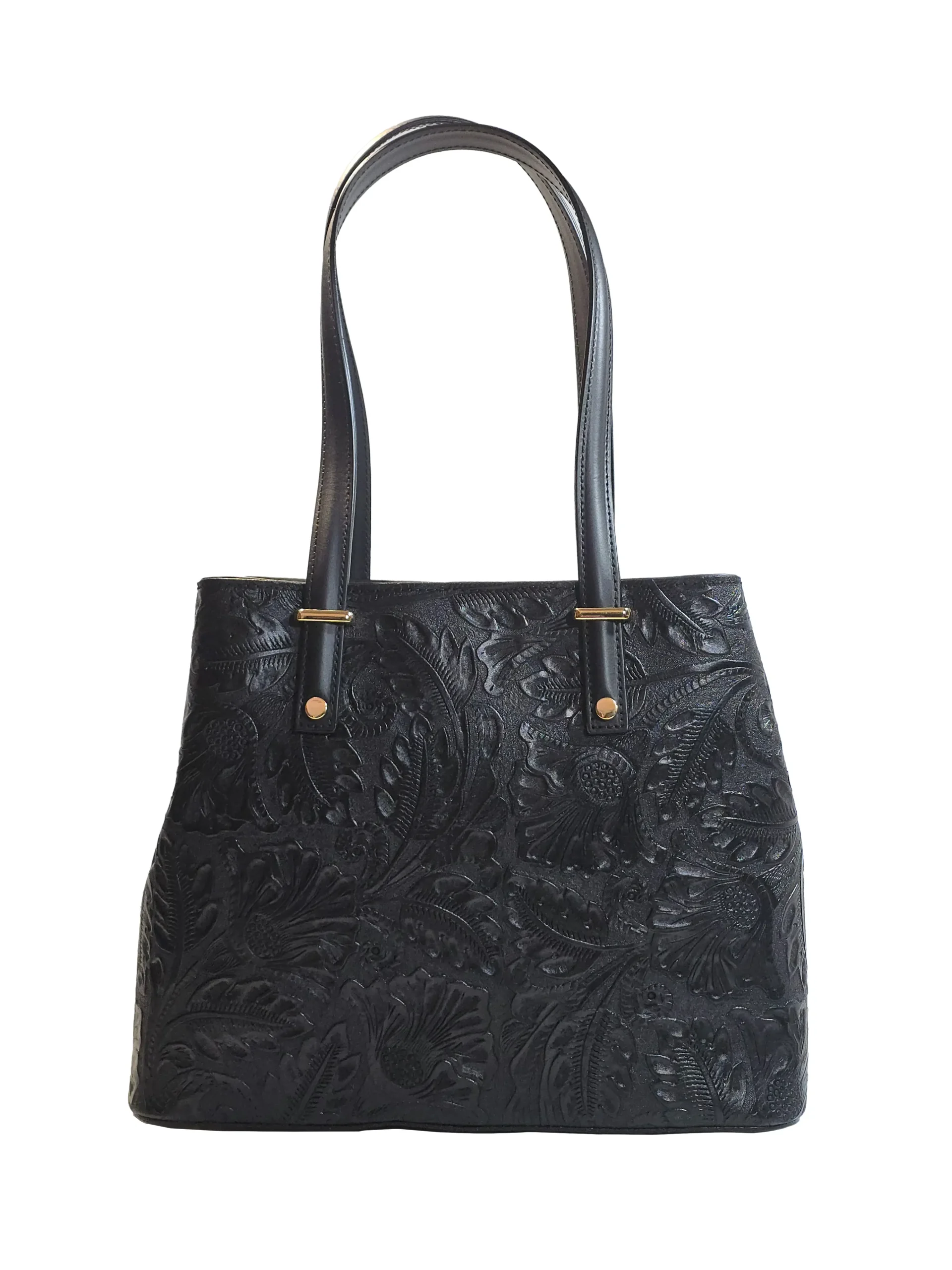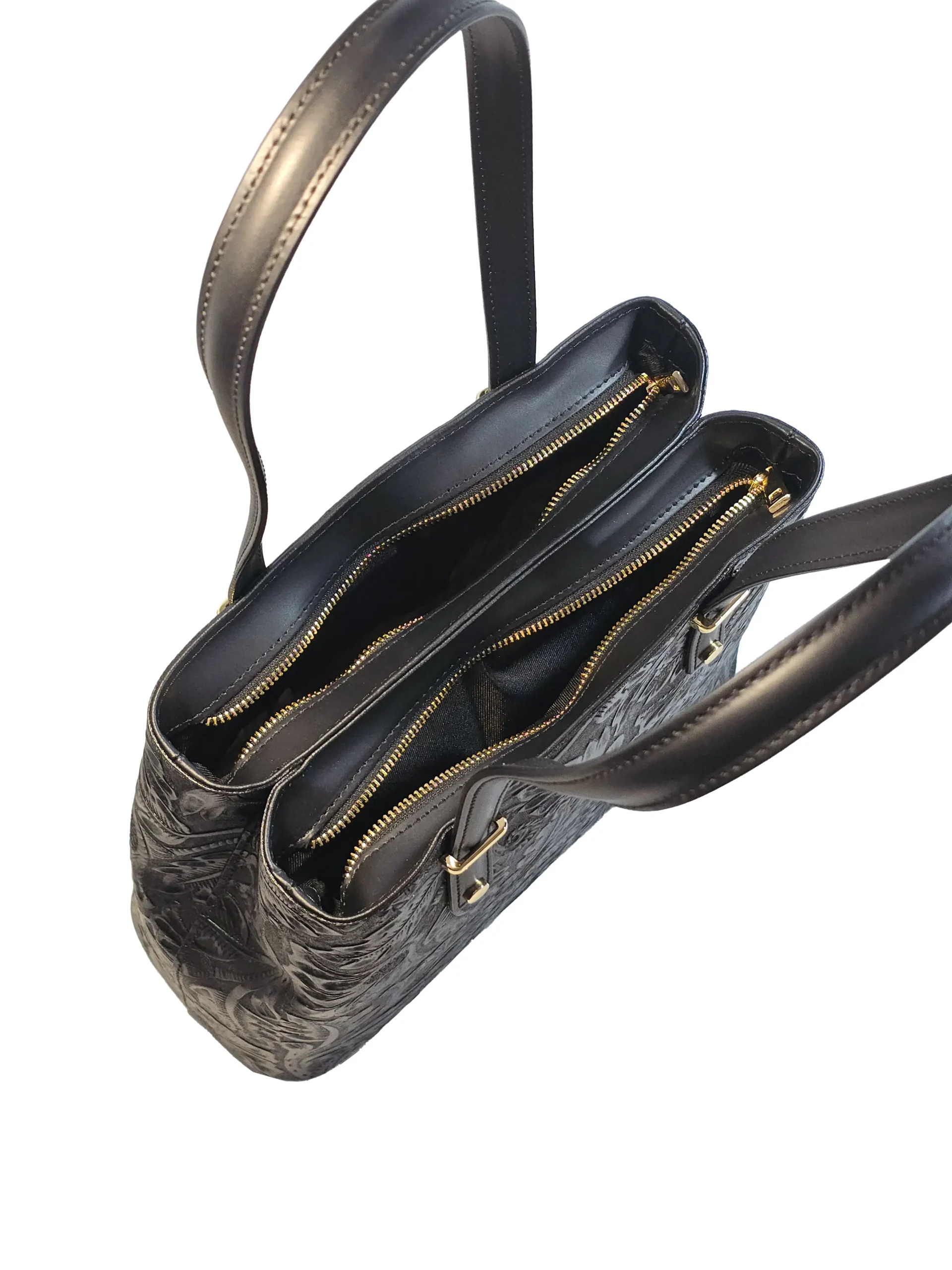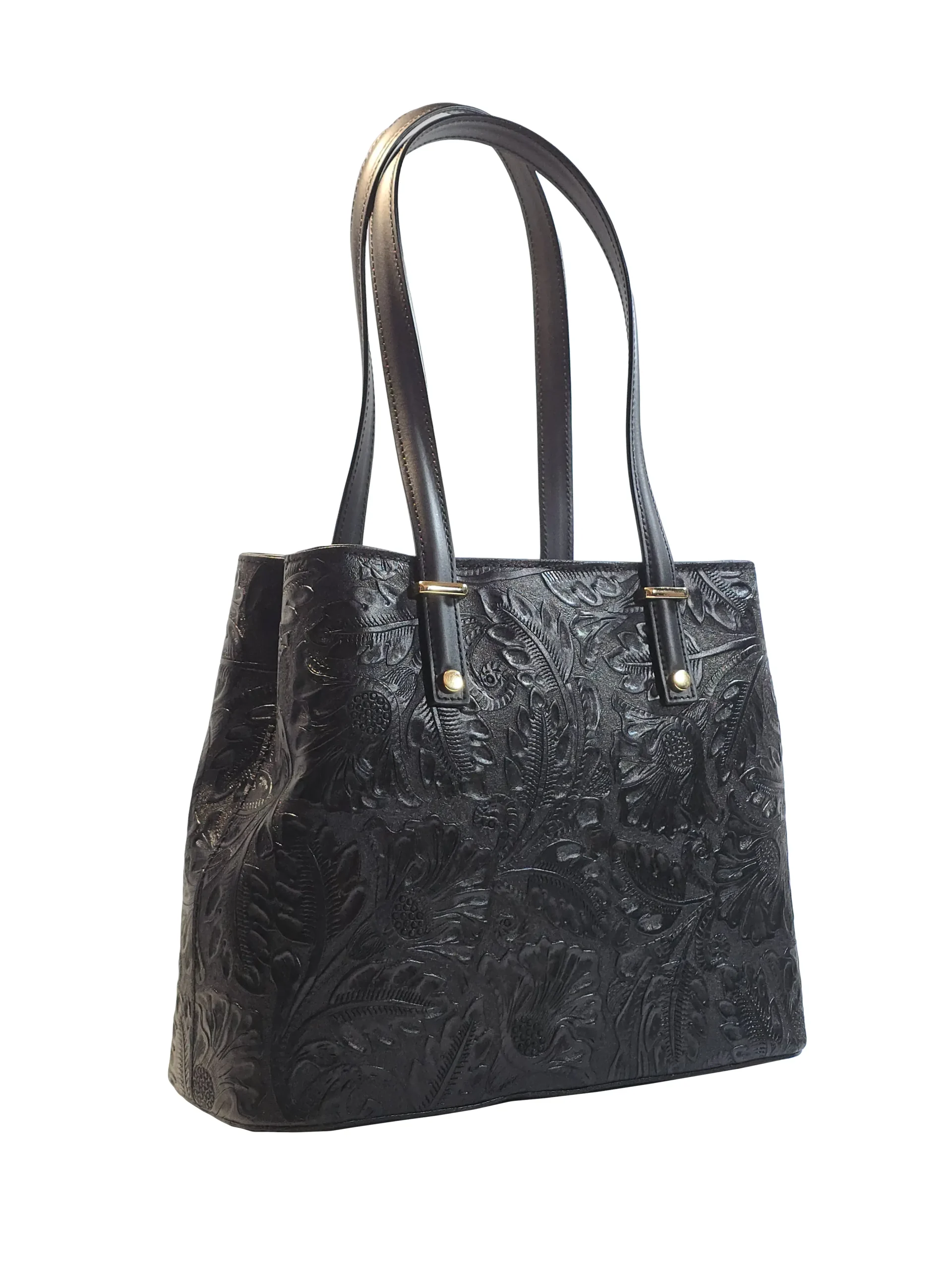 Чанта „Зоря“ – италианска дамска чанта tote от естествена кожа с релефен флорален мотив, дълги презрамки и двоен цип