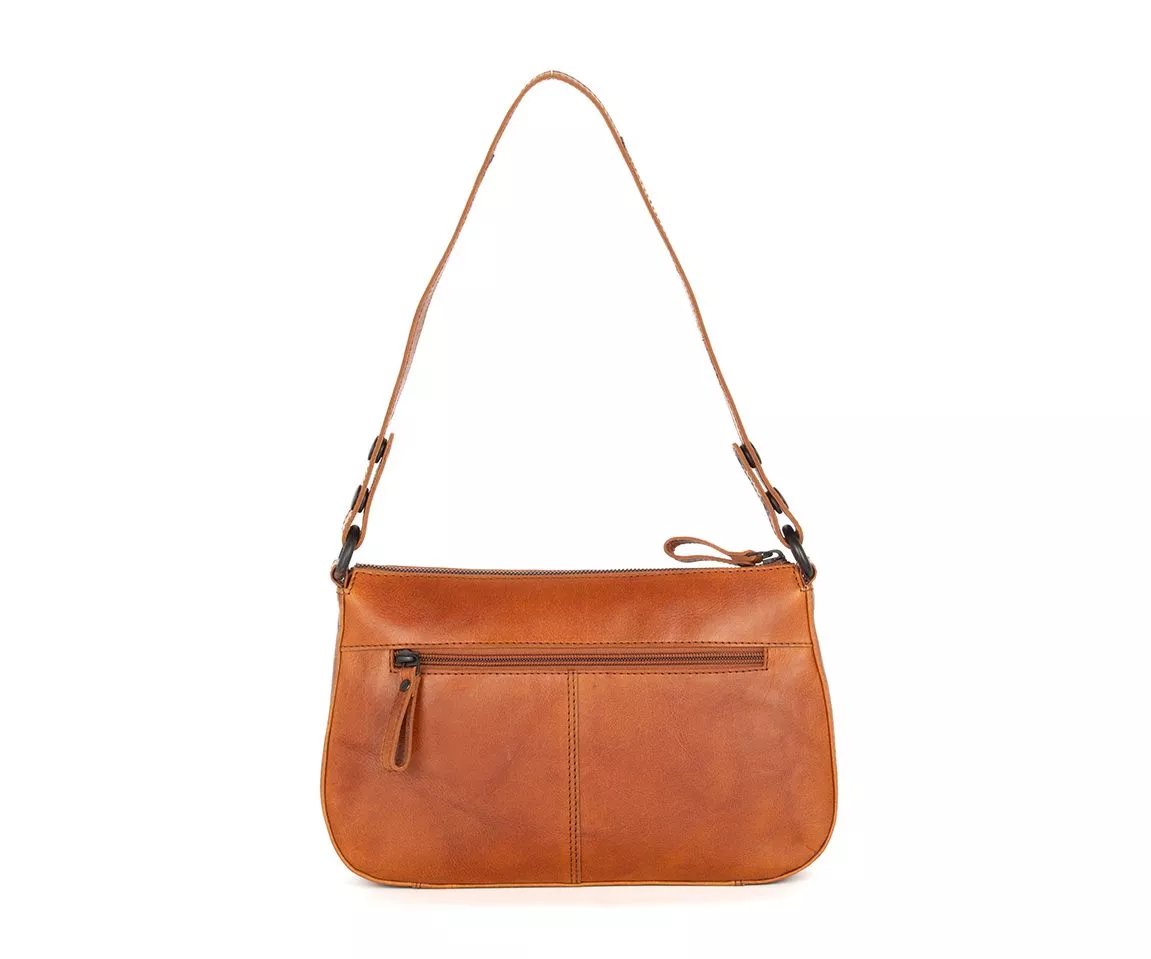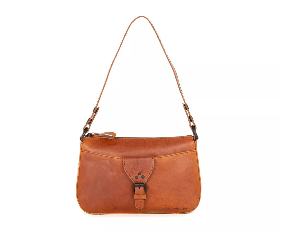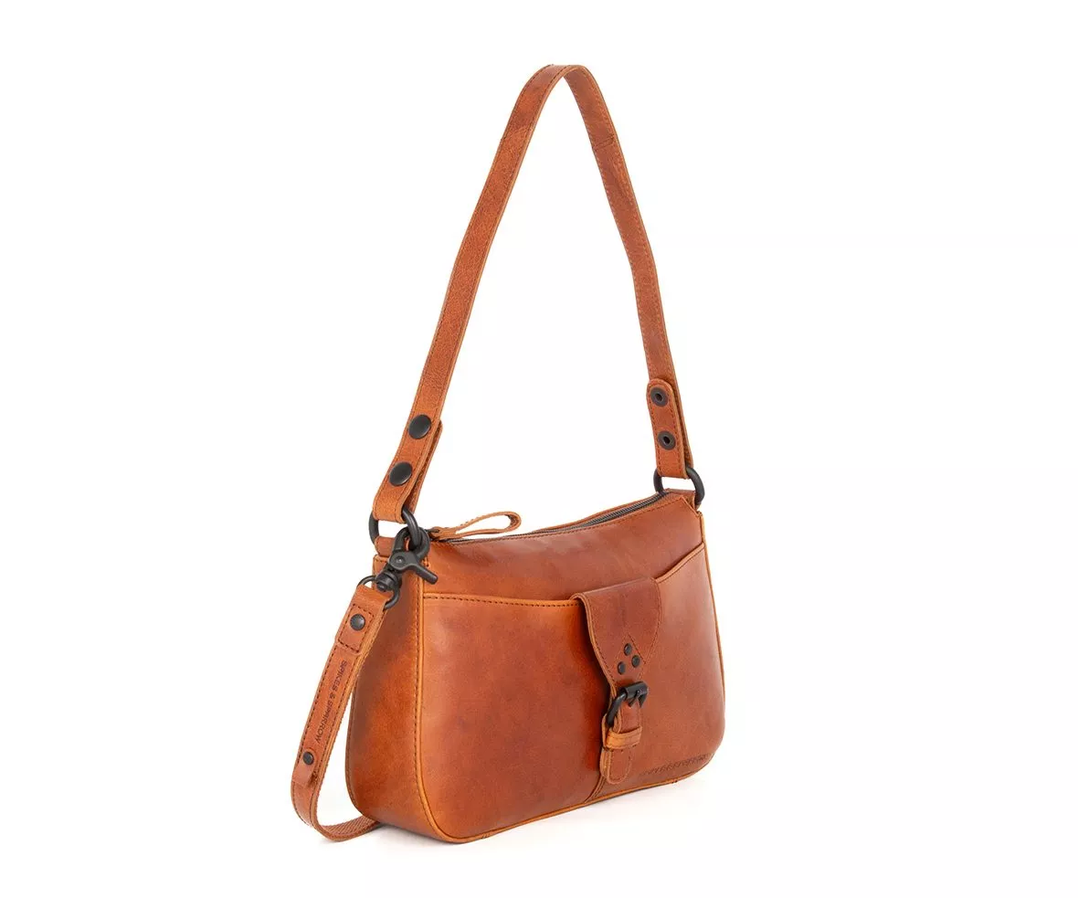 Кожената чанта за през рамо Ебъни от Spikes & Sparrow без усилие съчетава елегантност и здравина. Тази компактна чанта през рамо е изработена от здрава, ръчно подбрана бронзова кожа , известна с естествения си вид и богата текстура. Топлият цвят коняк (бренди) придава на чантата класически, но същевременно модерен вид.