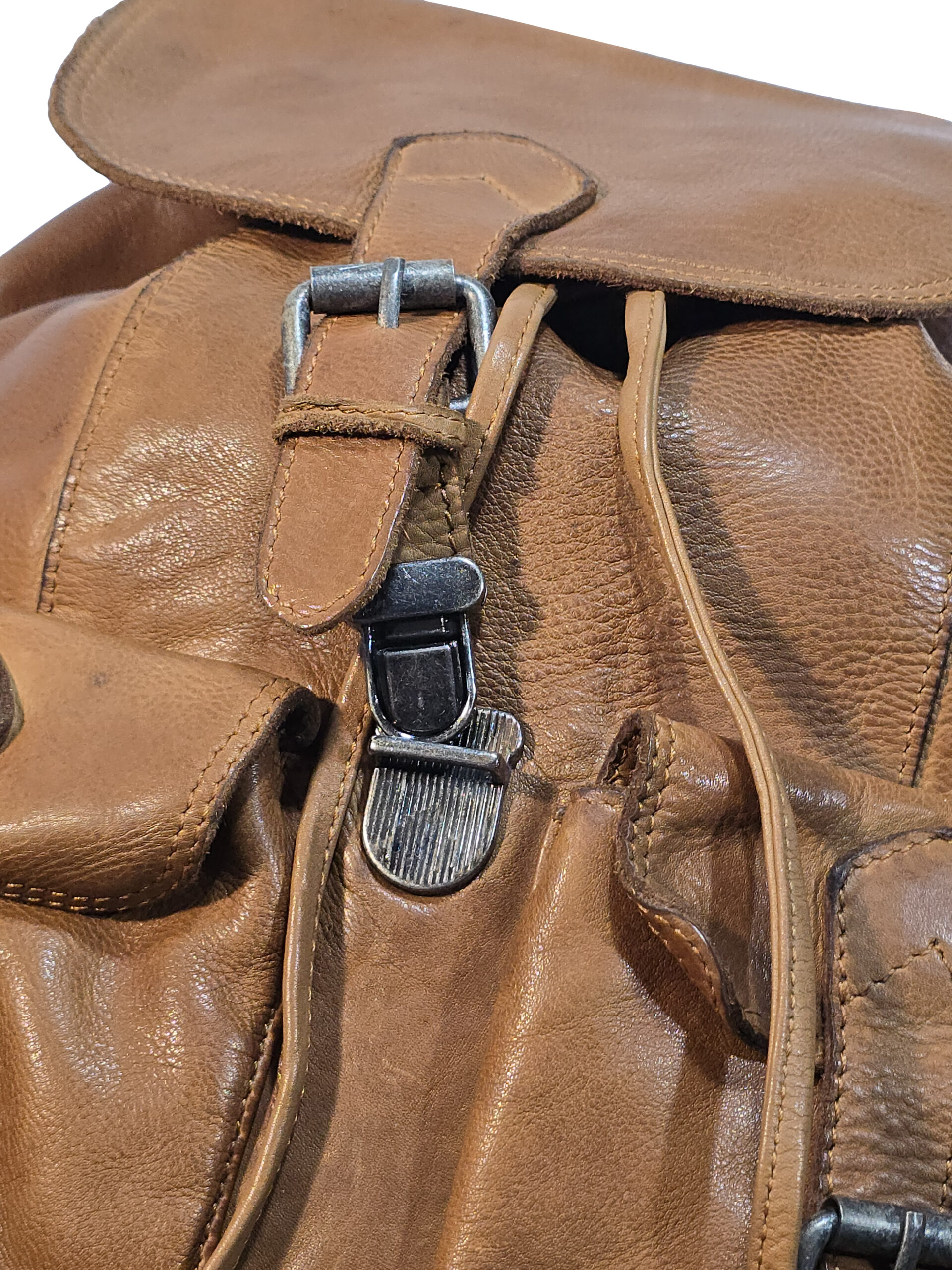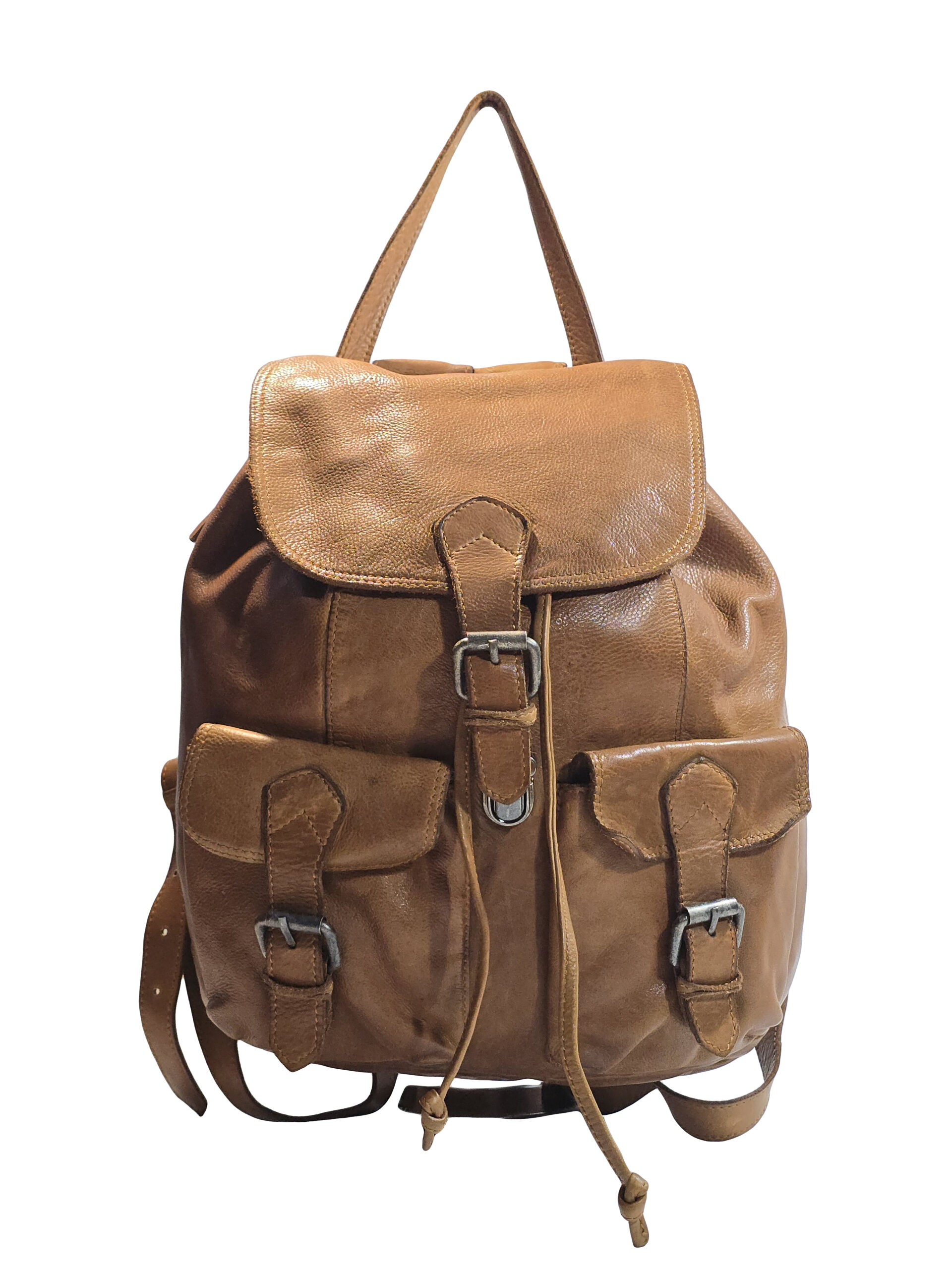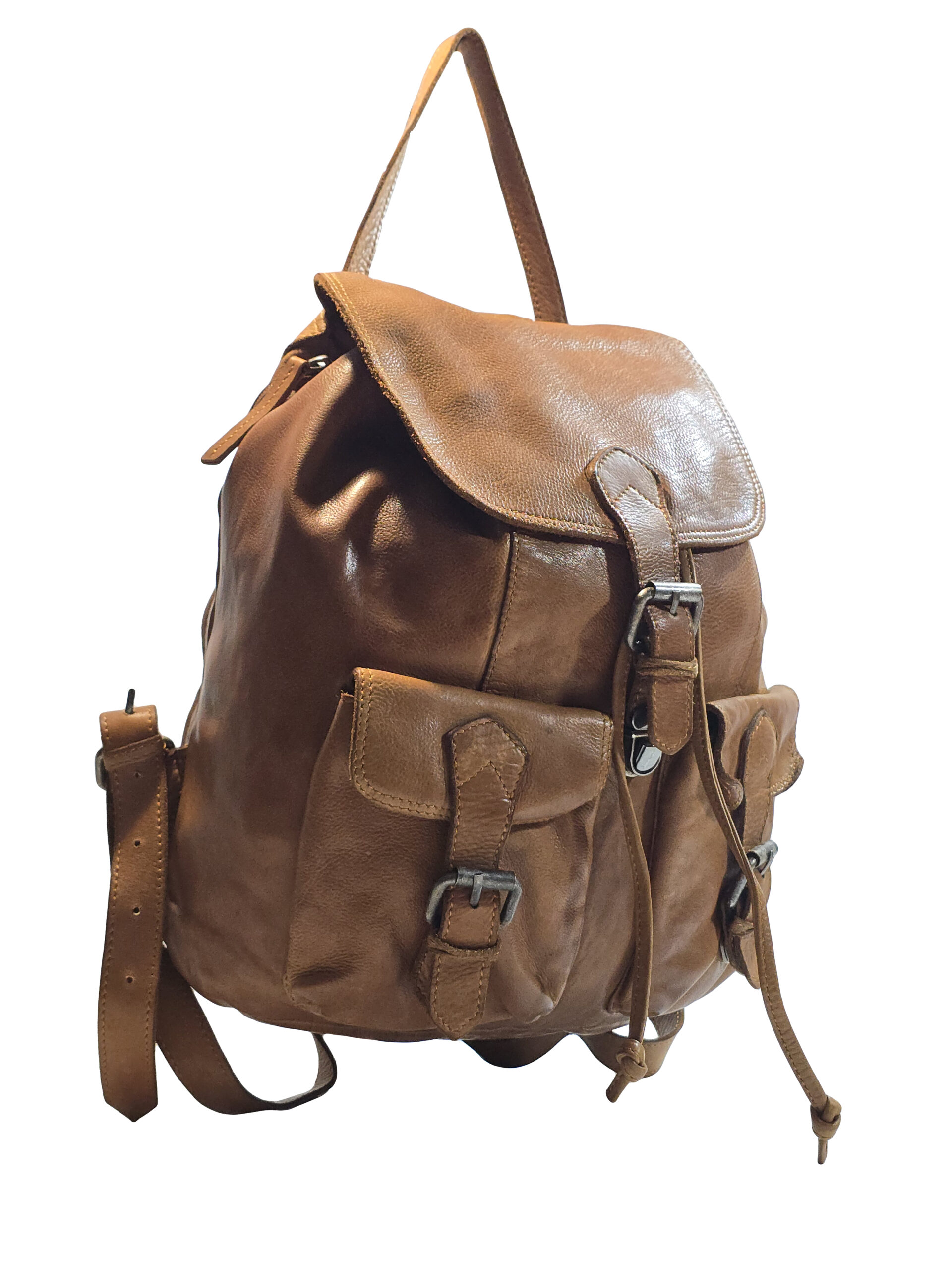Раница „Явора“ – дамска раница от естествена варена кожа с капак, шнур и предни джобове с катарами